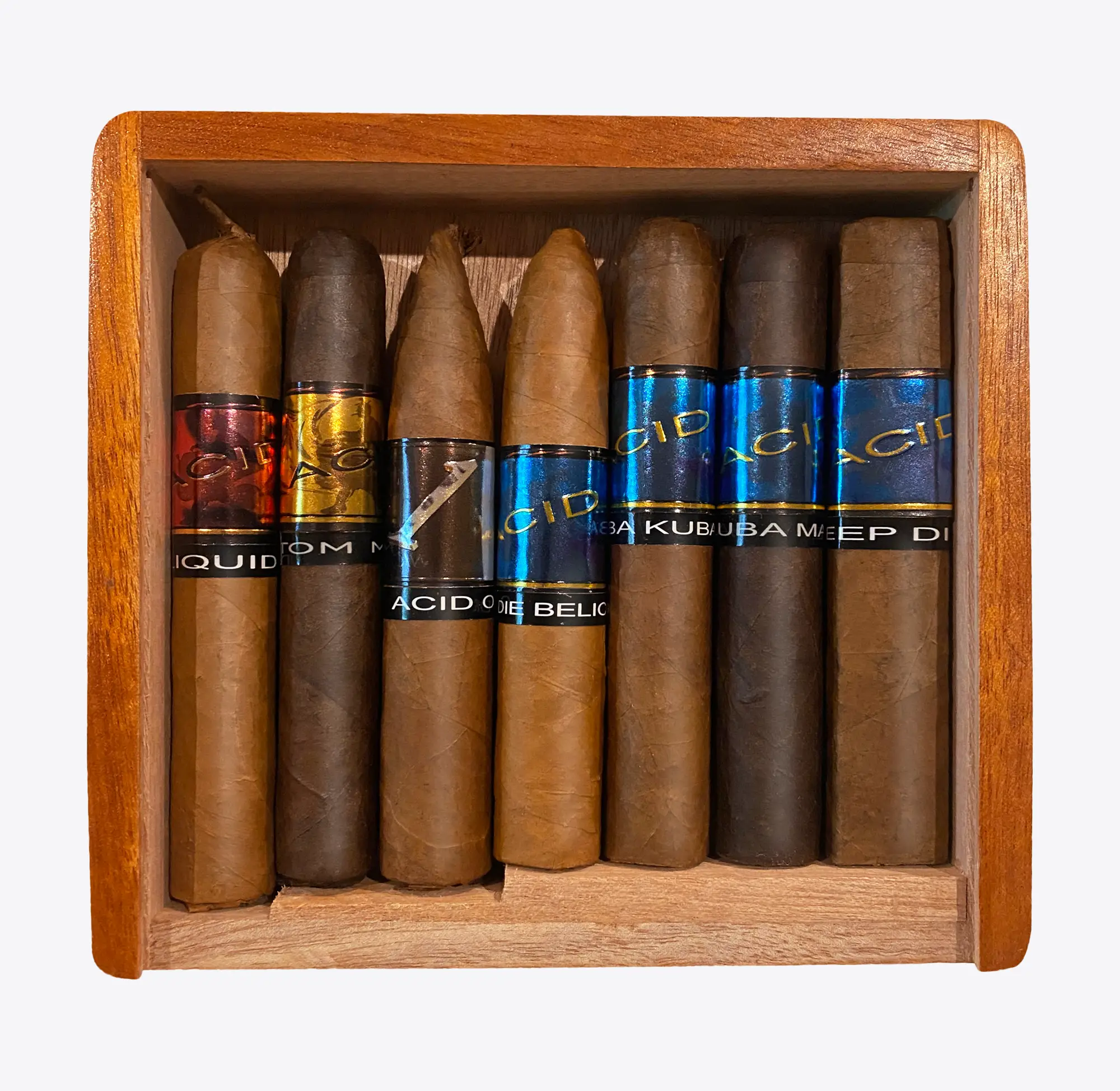 Inside are one each of ACID Kuba Kuba, Kuba Kuba Maduro, Blondie Belicoso, Deep Dish, Atom Maduro, Acid 20 Maduro, and 1400cc. Because this is an infused sampler, the profile shifts from cigar to cigar, but the line as a whole tends to lean aromatic, sweet-tinged, and herbal, with some blends moving toward darker cocoa, spice, or richer maduro weight.
