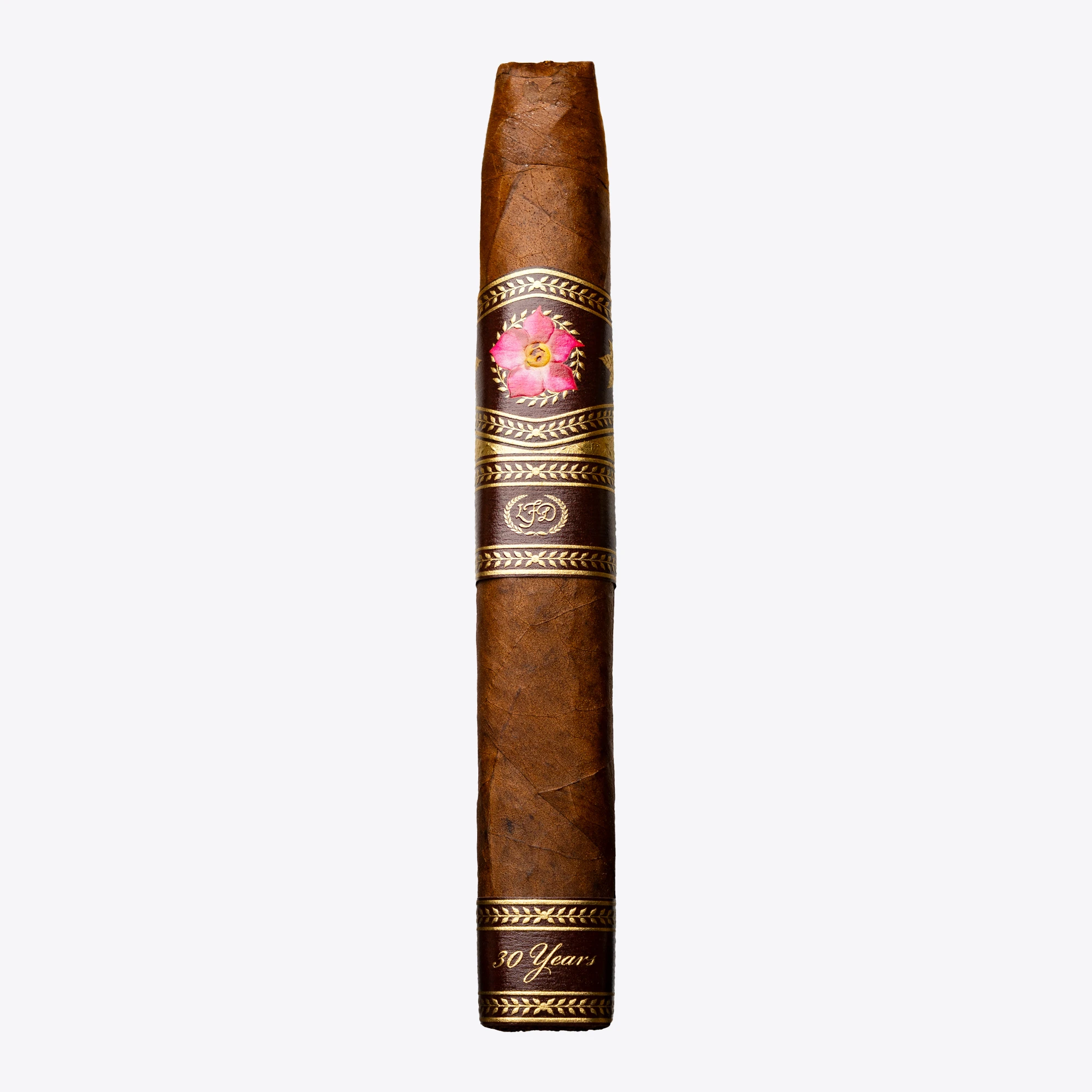 La Flor Dominicana 30th Anniversary was released to mark the company’s 30-year milestone and uses an Ecuadorian Sumatra wrapper over an aged binder from Cotuí and fillers from LFD’s La Canela farm in the Dominican Republic. It comes in a 6 1/2 x 58 box-pressed Chisel format, which gives it the line’s familiar wedge-shaped head and a more concentrated opening.