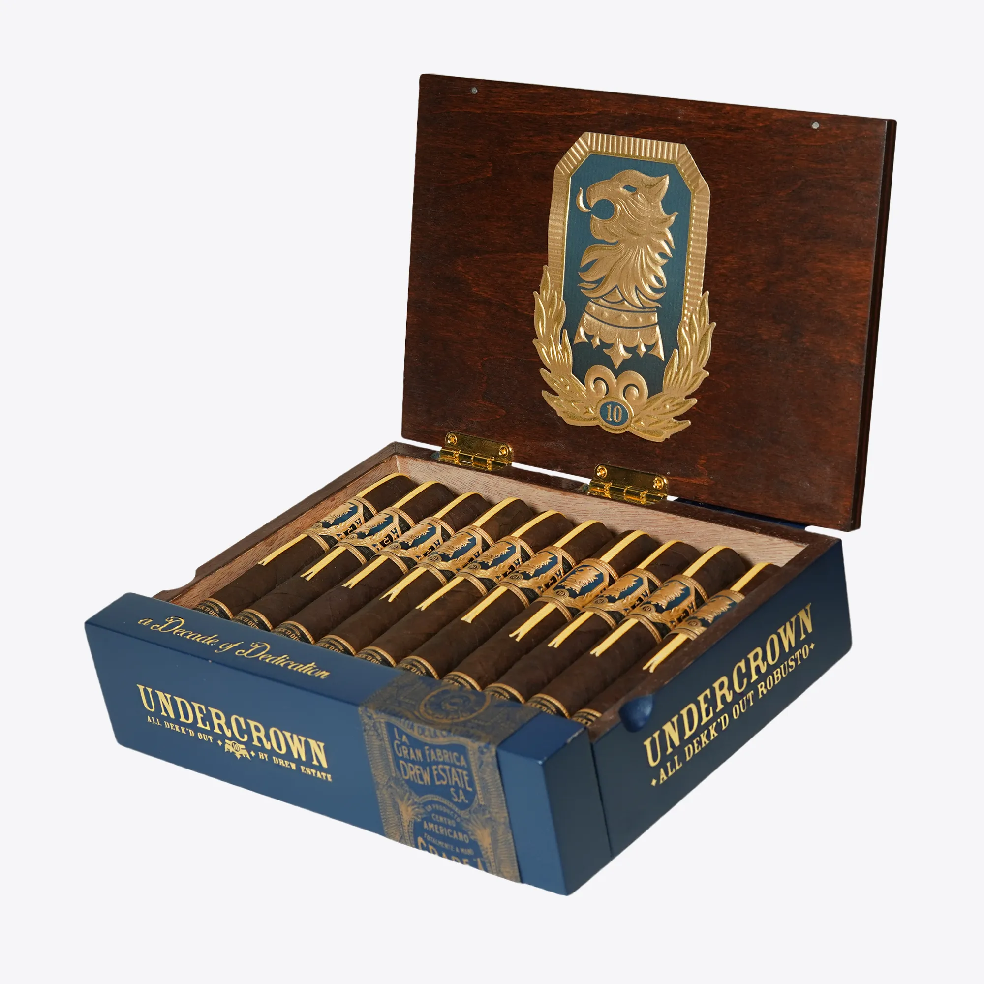 Cocoa-forward earth and pepper start things off. Liga Undercrown 10 Robusto is a 5 x 50 cigar from Drew Estate, rolled in Nicaragua and packaged in 20-count boxes. The blend is built on a Mexican San Andrés Negro Último Corte wrapper over a Connecticut Broadleaf binder with Nicaraguan and Honduran fillers, and it lands full in body.