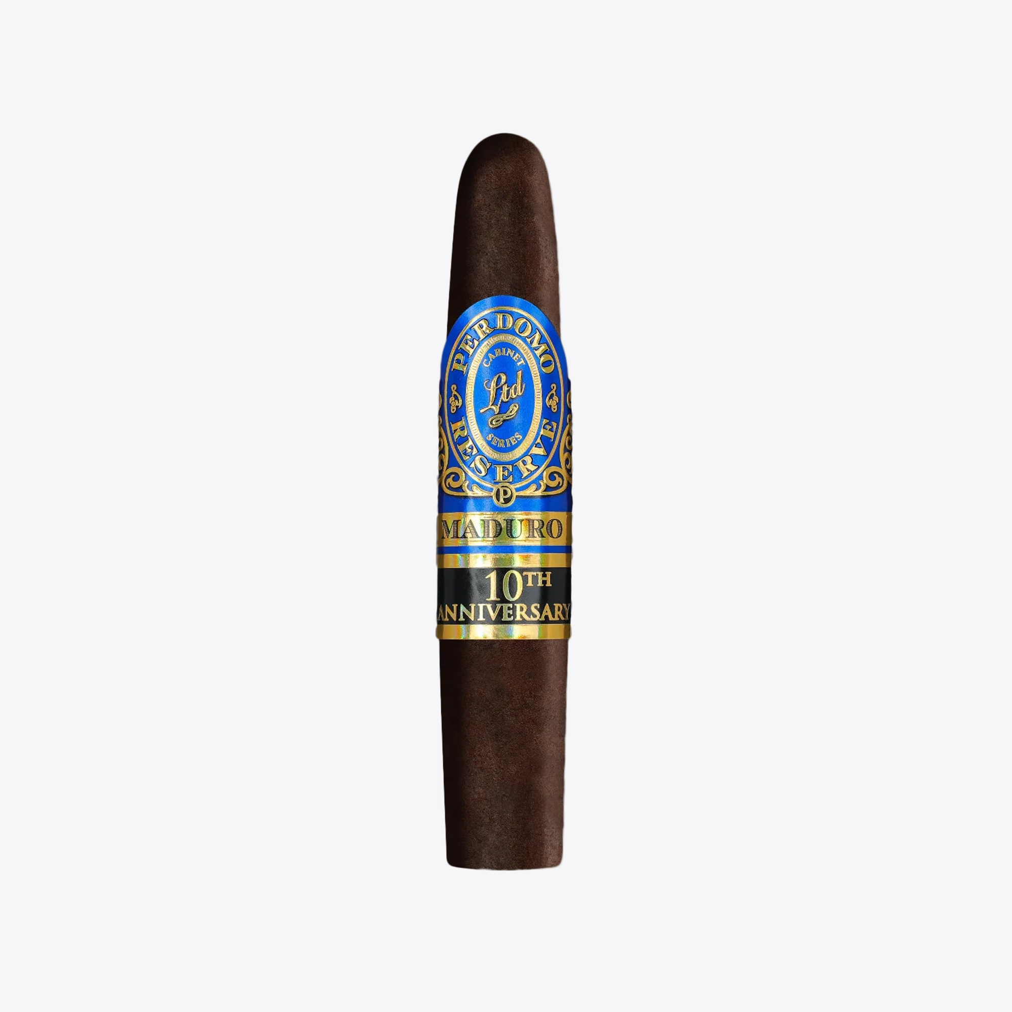 A darker-leaning smoke for an easy evening reset. Perdomo Reserve 10th Anniversary Maduro Figurado is the maduro expression of the Reserve 10th Anniversary line, rolled as a tapered figurado at 4 3/4 x 56 for a short format.